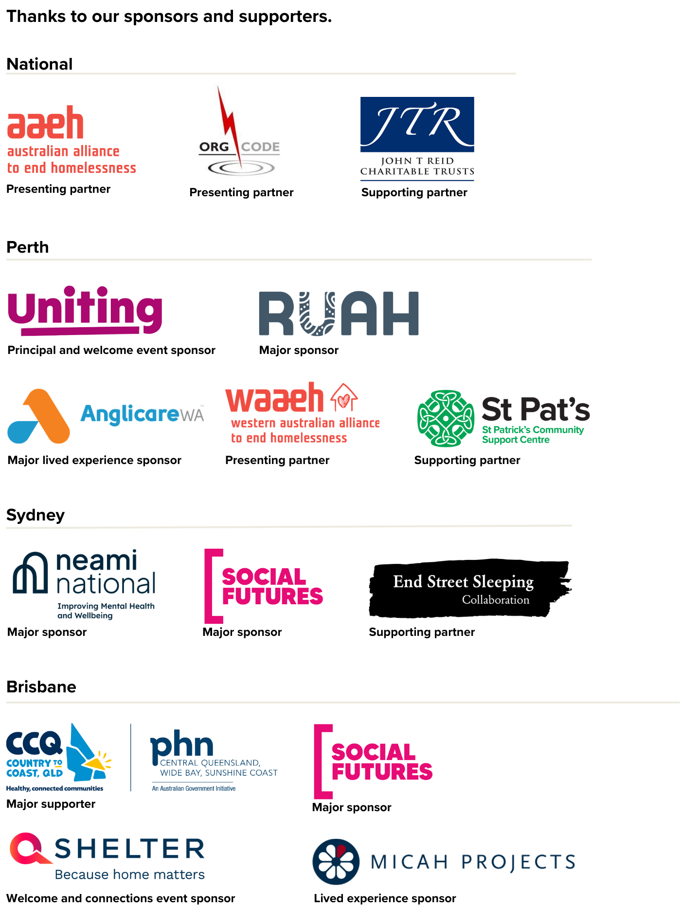 - exposure to the latest research and outcomes relating to ending homelessness.